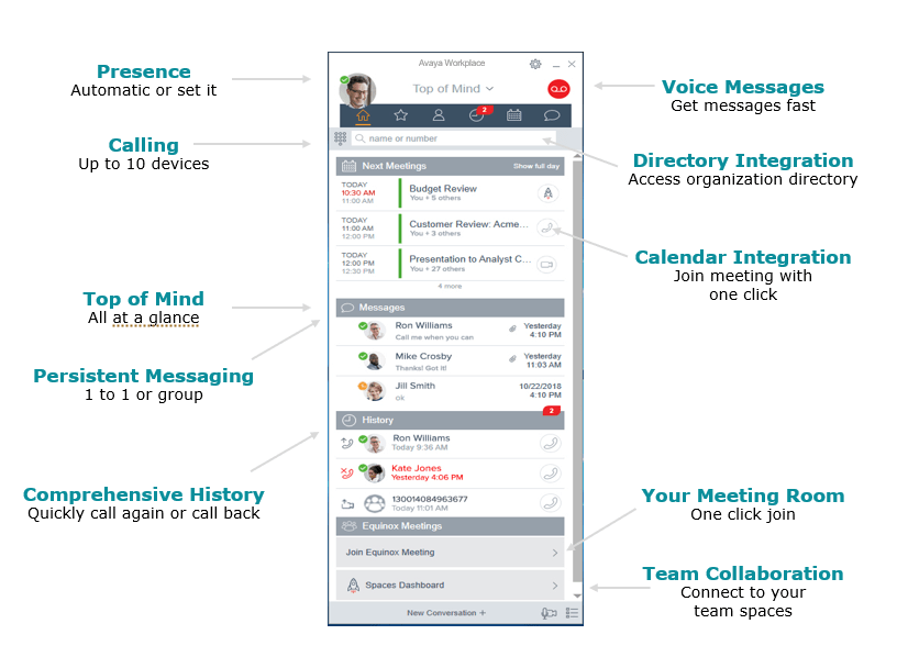 GÜNLÜK PROGRAMINIZA HIZLICA GÖZ ATABİLİRSİNİZ Avaya Workplace arayüzünde toplantı programınızı, mesajlarınızı ve çağrı geçmişinizi hızlıca gözden geçirebilirsiniz. Tek dokunuşla multimedya mesajlarınıza ulaşabilir, cevapsız çağrılarınıza dönüş yapabilir ve sesli/görüntülü konferanslara katılabilirsiniz.